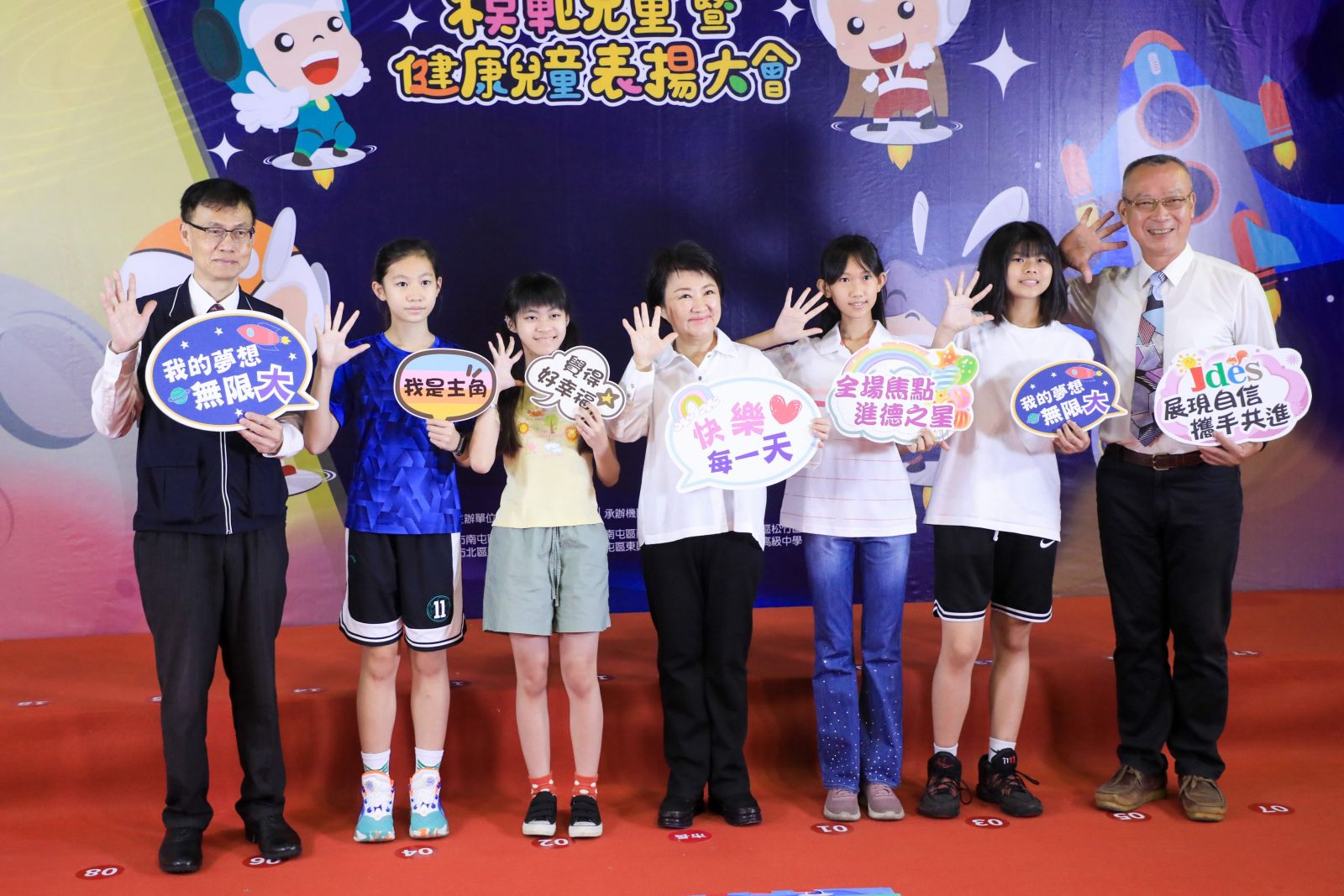 此外,為滿足在地就學需求,教育局陸續在新興人口增加地區新設校,並持續提升教育建設品質,也獲112年國家卓越建設獎肯定,台中市在校園建築工程部分,榮獲3座最高獎項「卓越獎」、2座「金質獎」和3座「優質獎」;同年也啟動「給孩子一個禮堂計畫」,興建25校學校禮堂,為孩子圓夢,預計於明年底全數完工,提供孩子更舒適的活動學習場域。今日表揚大會,延續兒童節活動主題「未來主人翁,今天我做主」,打造星際視覺,象徵孩子們勇敢探索未知,成為獨特不可取代的閃耀之星。
