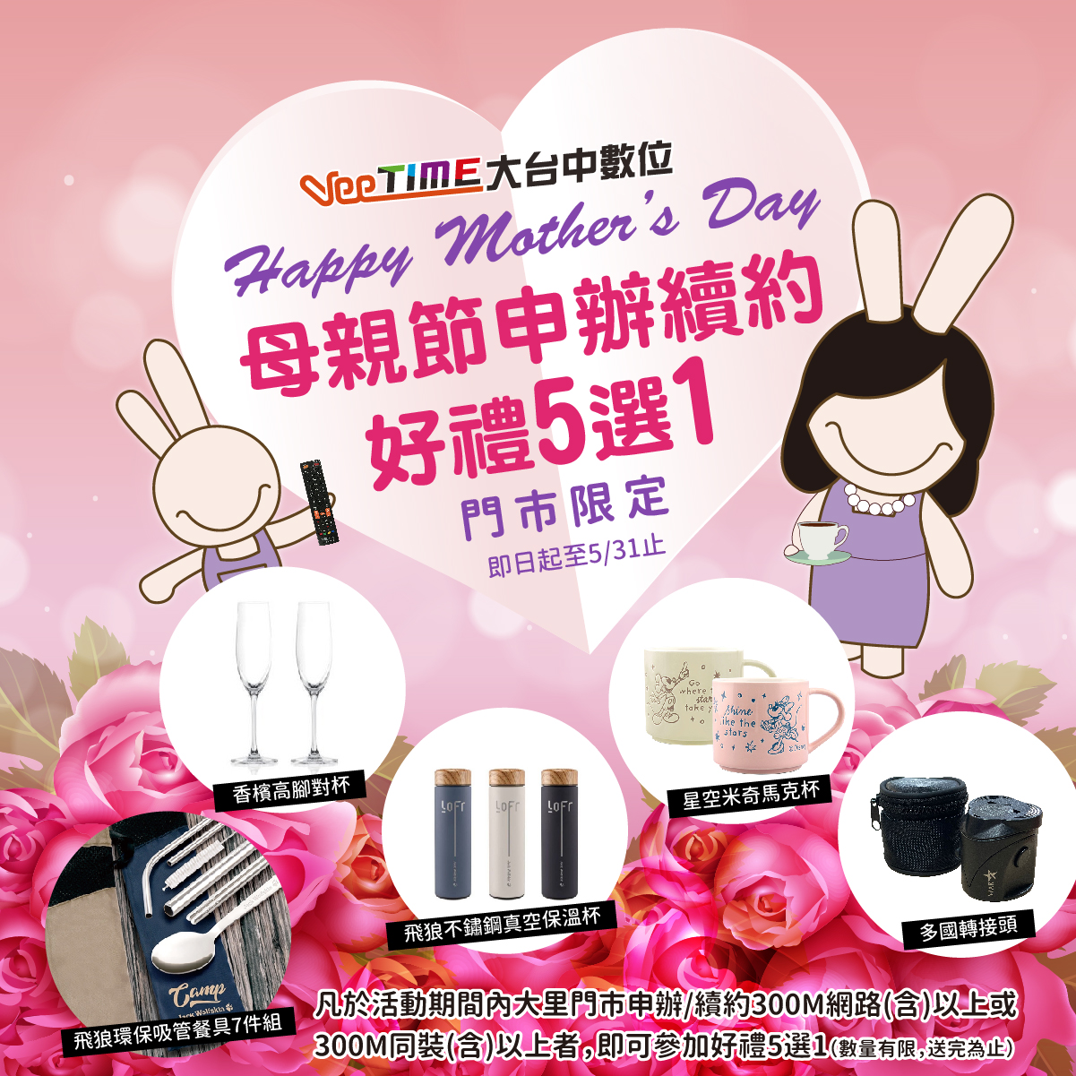 台中市寬頻業者「大台中數位」除了發起「媽媽的拿手菜」分享活動之外,並在溫馨的五月期間於大里門市舉辦期間限定活動,凡至門市申辦或續約指定方案者,即可參加好禮五選一(數量有限,送完為止)