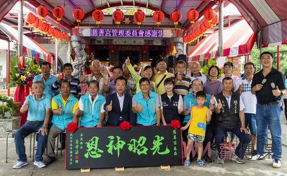 ▲鹿草鄉慈善宮主祀大寮伯公對在地教育貢獻良多,縣長翁章梁前往贈匾「光昭神恩」祭祀獻花獻果。