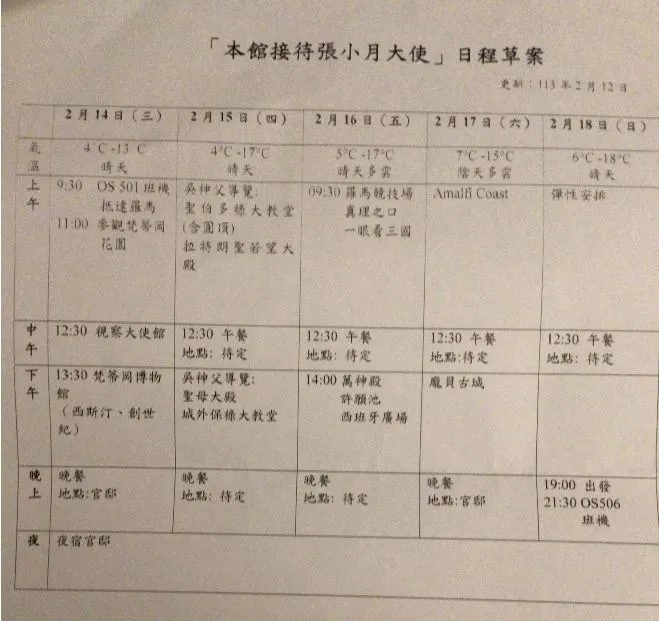 外交部對外解釋,指駐奧地利大使張小月是以個人休假名義前往義大利羅馬、教廷,試圖撇清「假考察真旅遊」的質疑,然而,5天4夜的行程全由當地使館安排妥當,規劃了接機、視察、午晚餐,還夜宿官邸,要說這是個人休假行程,豈不是太糟蹋負責相關繁瑣工作的外交官員?或是其中有什麼不足為外人道的潛規則?