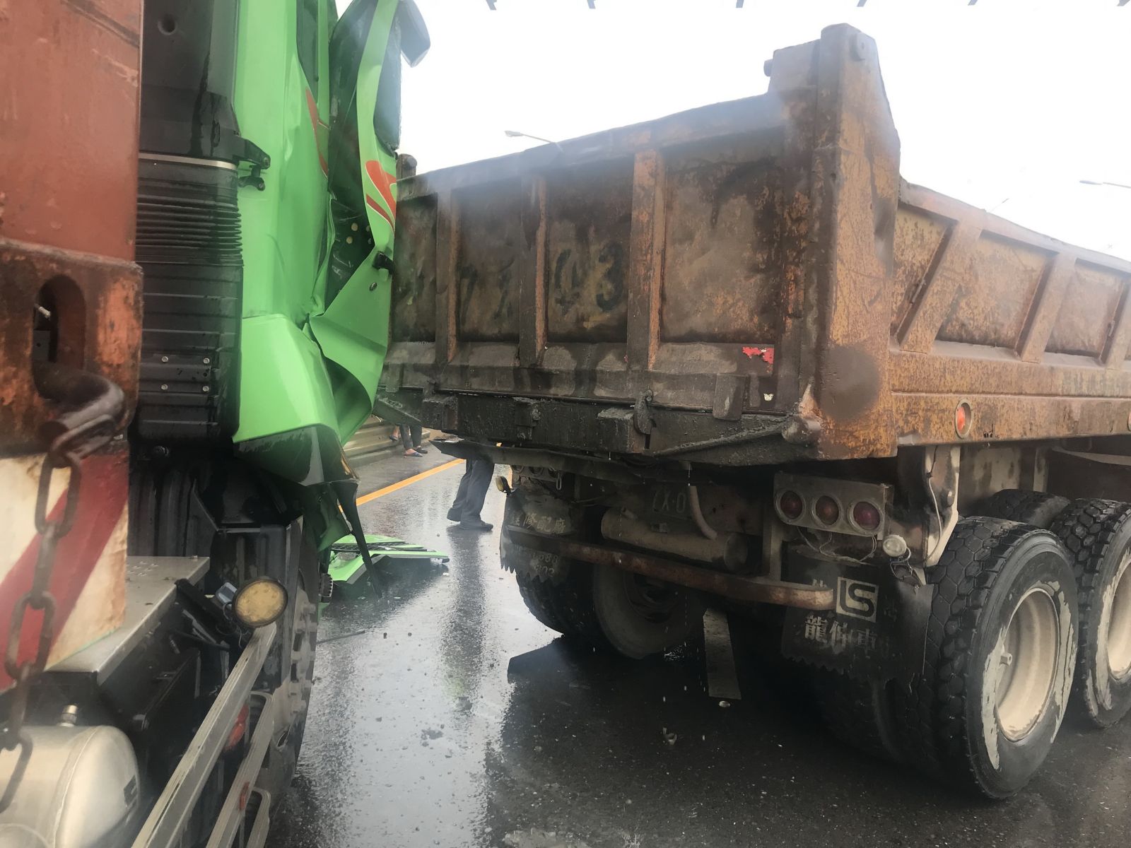 台61線再度車禍 貨櫃車與砂石車相撞 砂石車「折甘蔗」