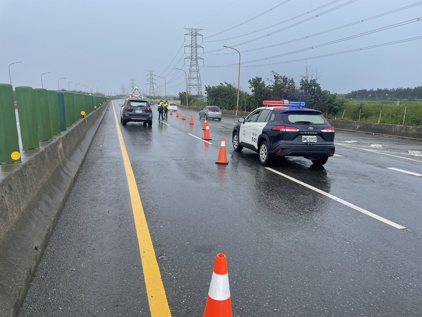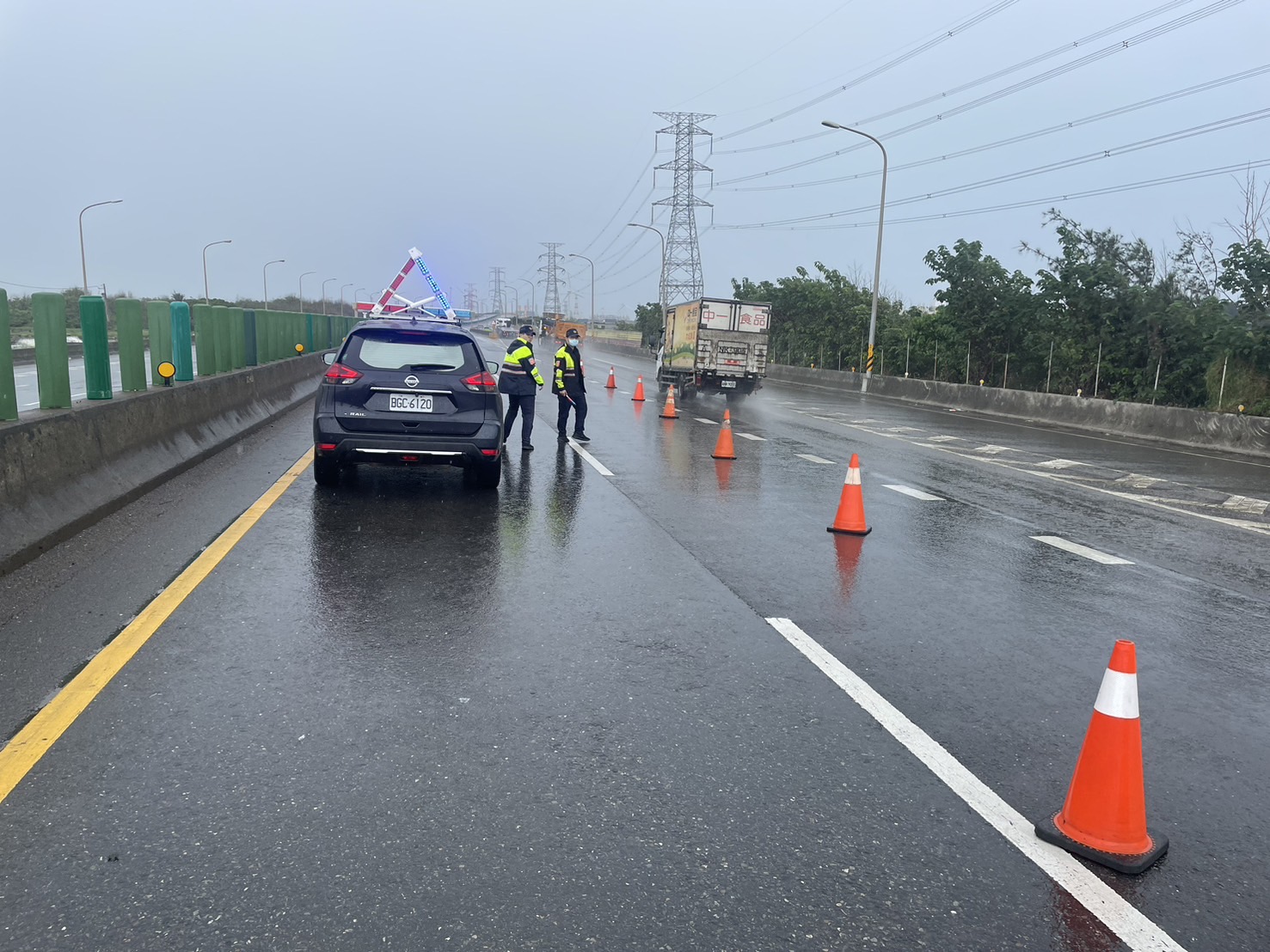 警方調查,詹姓司機駕駛貨櫃車行駛內側車道,疑因天雨路滑又未保持適當距離,急剎車頭90度轉彎,擦撞外側車道周姓司機駕駛的砂石車,事故占用兩線道,警方據報全線封閉。幸好沒人受傷,警方通知吊車到場排除事故,但車禍造成迴堵。