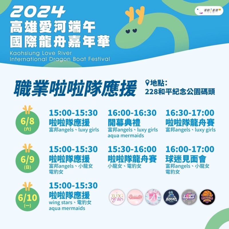 國際龍舟嘉年華三天賽事,啦啦隊女孩將會在愛河畔展開一系列活動,在每天的下午3點到3點半皆有為龍舟參賽選手加油的啦啦隊應援活動,6月8日富邦Angels、Luxy Girls演出,6月9日則是富邦Angels、味全龍小龍女、電豹女上場,6月10日包含高雄在地的Wing Stars、Aqua Mermaids以及電豹女將要為精彩國際友誼賽及決賽進行應援,活動三天的下午3點半到4點還有職業級競技啦啦隊協會演出。