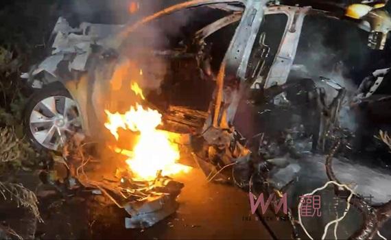 (觀傳媒雲林新聞)【記者蘇榮泉/雲林報導】虎尾消防分隊接獲報告指出,113年6月6日晚上21時12分,在虎尾鎮下溪里三塊厝橋附近(國道1號高速公路橋下)發生一起特斯拉汽車墜落6公尺橋下斷2截,並起火燃燒的意外事故。當時現場有1人當場死亡,2人輕傷。