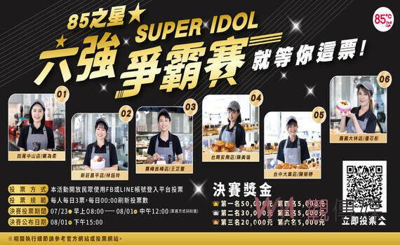 (觀傳媒中彰投新聞)【記者廖妙茜/台中報導】歡慶85℃二十週年生日,號召全台門市總動員,徵選85℃ SUPER IDOL最佳人氣店員,來自全台門市69位員工報名參加,經過激烈半個月的初選,超過三萬人參與投票,累積票數高達23萬票,最後六位入圍者以超高人氣成功突圍,晉級總決賽。7/23-8/1六強爭霸賽,民眾可以透過線上投票,為自己喜愛的選手投票,票數最高者將獲得獎金第一名現金五萬元,第二名三萬元,第三名兩萬元。