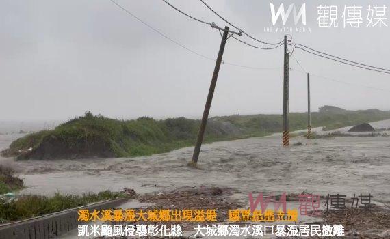 ▲凱米颱風雨彈狂襲,大城鄉濁水溪口暴漲,溪水淹過堤防,縣長王惠美趕往視察後,緊急請求國軍協助通知6村4423人撤離避難。