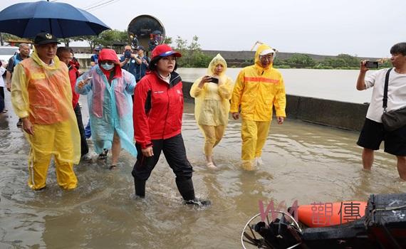 在主持完災害應變中心會議後,張麗善縣長於行政院長卓榮泰下午前往元長鄉、斗南鎮視察災情前,前往大埤鄉,在林森寶鄉長陪同下巡視延潭大排排水情況,並涉水為西鎮村民送餐,關心當地淹水狀況。