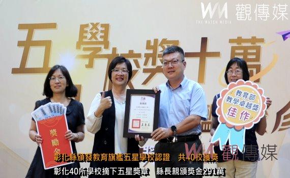 (觀傳媒彰化新聞)【記者陳雅芳/彰化報導】彰化縣政府今(30)日在彰泰國中熱鬧舉行教育旗艦五星學校的頒獎典禮,縣長王惠美頒發獎狀和獎金,表揚表現優異的學校。自去年起,縣府開始評選五星學校,今年增加到40所,共發出291萬3,000元的獎金,比去年多了80萬呢,王惠美期望未來有更多學校能突破自我、創新進步。