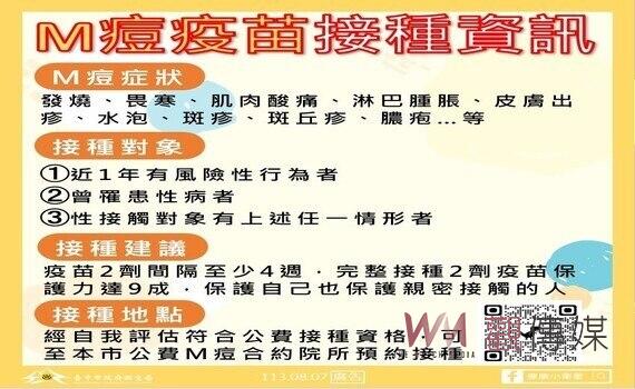 近期適逢暑假假期以及七夕情人節將至,社交活動頻率大增,民眾需留意自身健康,呼籲符合M痘疫苗接種條件的民眾儘速完成2劑疫苗接種,接種第1劑M痘疫苗14天後,對疾病的保護力僅有約4成至8成,而完成接種2劑疫苗後,則可高達9成保護力。