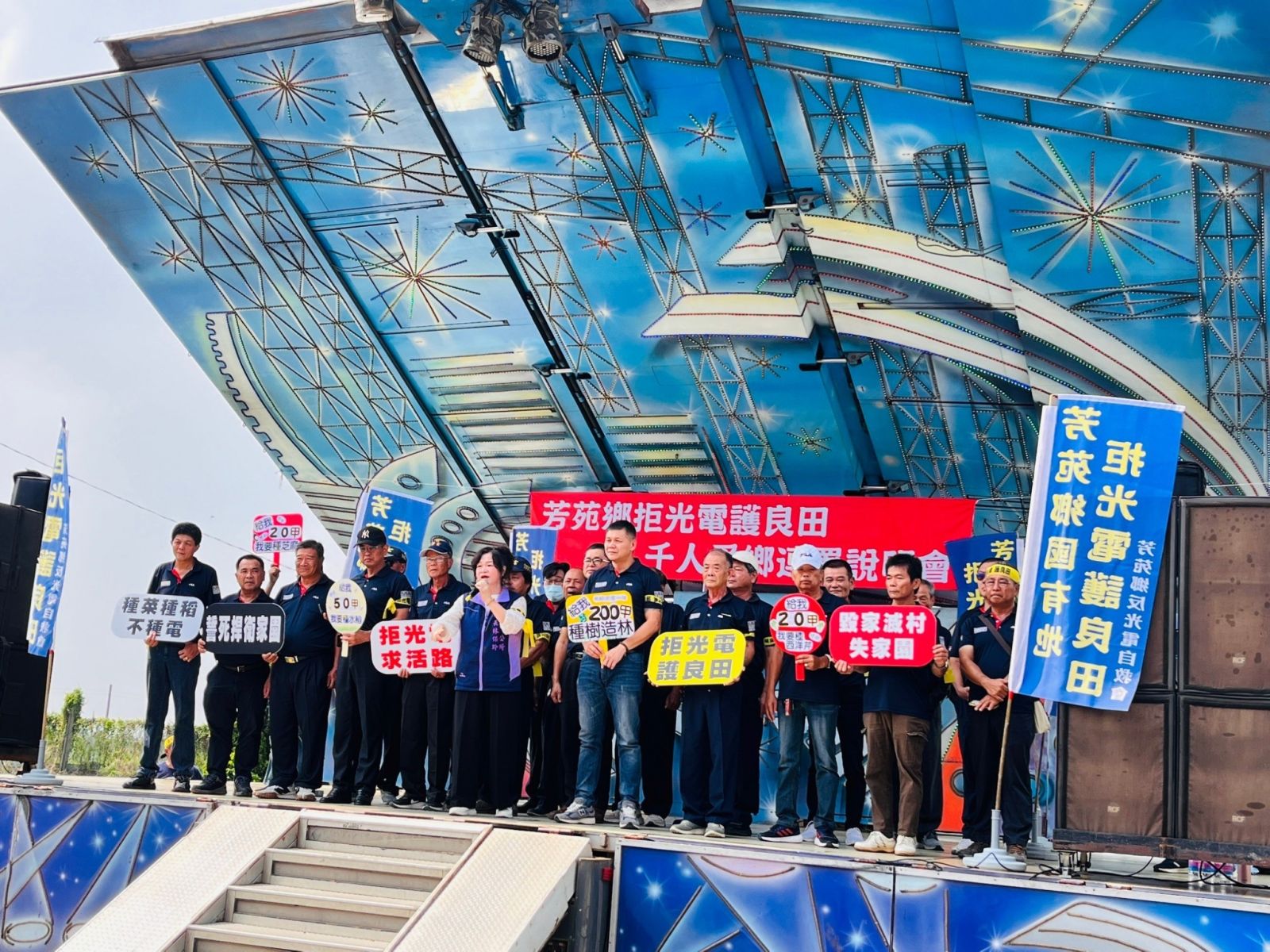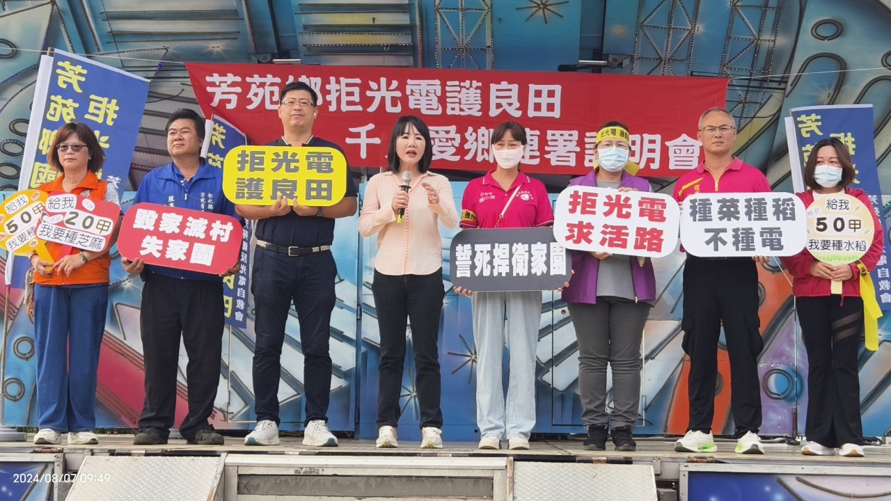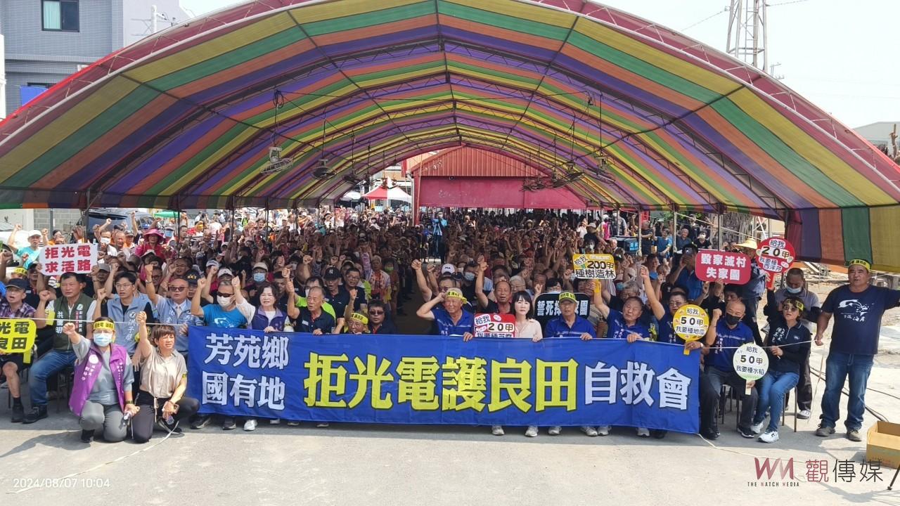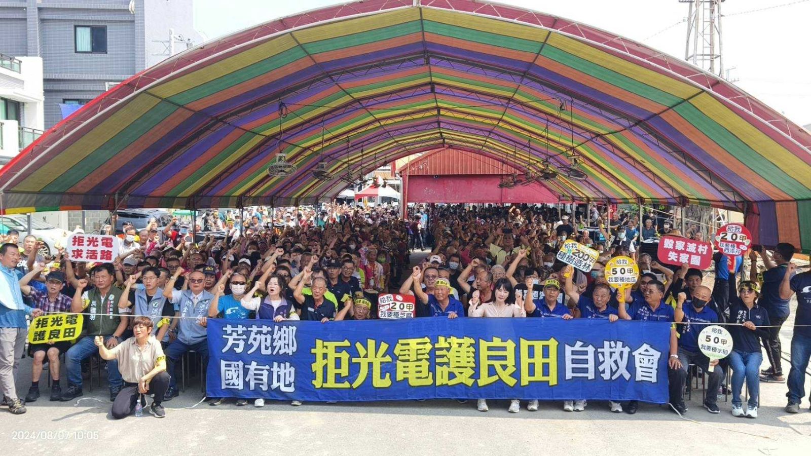芳苑鄉親認為,開發光電無疑斬斷農民生路,成立自救會反對,自救會上千名成員今天一干集結草湖保安宮,舉行「芳苑鄉拒光電護良田,千人愛鄉連署說明會」抗議,鄉長林保玲、退休檢察官林在培也到場聲援,要求國有財產局撤銷同意,眾人齊喊「我要種田,不要種電」。