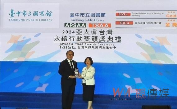 (觀傳媒中彰投新聞)【記者廖妙茜/台中報導】閱讀力就是城市競爭力!台中推動城市閱讀有成,今(8)日財團法人台灣永續能源研究基金會於台北世貿一館舉辦2024第三屆亞太暨台灣永續行動獎頒獎典禮,台中市立圖書館以「城市永續行動閱讀」榮獲「亞太永續行動獎」及「台灣永續行動獎」雙金獎殊榮,由台中市政府文化局主任秘書蕭靜萍代表受獎。此次獲獎彰顯台中市響應聯合國永續發展目標的卓越表現,期望市民能持續參與並支持永續閱讀行動,共同為台中的美好未來努力。