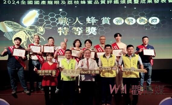(觀傳媒中彰投新聞)【記者廖妙茜/台中報導】為推廣國產優質龍眼蜂蜜,農業部農糧署輔導台灣養蜂協會辦理113年全國蜂蜜品質評鑑,共有58位蜂農獲獎,於今(10)日在臺中林皇宮舉辦「2024全國國產龍眼及荔枝蜂蜜品質評鑑頒獎典禮暨成果發表會」。受本年度氣候影響龍眼及荔枝開花,導致蜂蜜產量減少,今年得獎蜂蜜更顯珍貴,請民眾把握機會多加採購,用行動支持辛苦的蜂農。