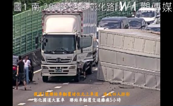 (觀傳媒彰化新聞)【記者陳雅芳/彰化報導】國道1號中山高速公路北向200.5公里彰化路段,今(16)日上午約10點半發生聯結車與轎車事故,其中聯結車的子車翻覆,北上車道幾乎全被占據,拖吊事故車與清理現場,轎車上4名乘客輕傷送醫,塞車時間長達5小時,事故發生原因與肇事責任由國道三隊調查。