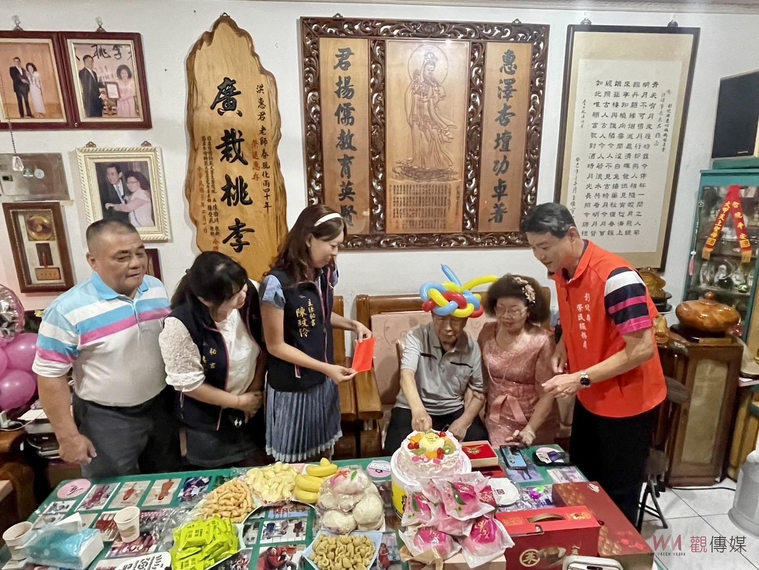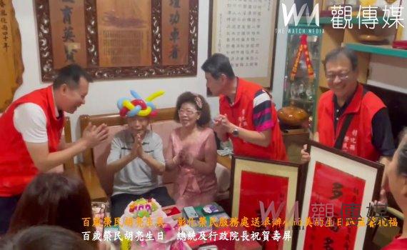 (觀傳媒彰化新聞)【記者陳雅芳/彰化報導】彰化縣榮民胡亮晉升百歲人瑞,彰化縣榮民服務處特別在其住處為他舉辦小而美的生日趴,榮民服務處處長邱文俊轉頒總統及行政院長祝賀壽屏,並代表輔導會致贈紀念金壽桃項鍊為其祝壽,彰化縣議員張錦昆、大村鄉公所主任秘書陳玟伶等多人齊唱生日快樂歌予以祝福,氣氛溫馨熱鬧。