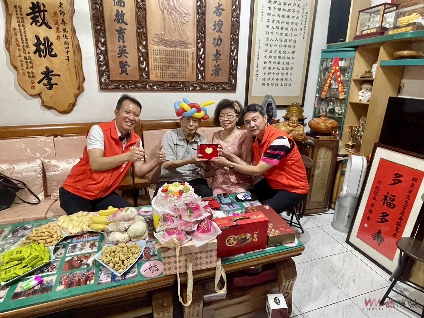 彰化縣榮民服務處處長邱文俊率副處長鍾翔宇、責任區輔導員、社區服務組長及榮欣志工並偕同彰化縣議員張錦坤、大村鄉公所主任秘書陳玟伶、村長及里幹事等一行人,前往大村鄉為百歲榮民胡伯伯慶生,由邱文俊處長轉贈總統及行政院院長壽屏,並為胡伯伯準備生日蛋糕、保健養生品,親自為爺爺送上輔導會致贈的祝壽紀念金飾,表達誠摯祝賀之意,祝胡伯伯萬壽無疆、福壽綿長。