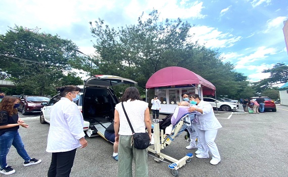 八月二十五日祖父母節前夕,中榮埔里分院為黃爺爺舉辦一場返家圓夢計畫。因身陷疾病苦痛,使身心靈的受苦,侵蝕著黃爺爺的生存希望,當子女、孫子女來探視黃爺爺時,爺爺提到想要回家的念頭,關懷師藉由生命回顧得知黃爺爺也掛念著家中的毛小孩妞妞和元元及想返家落葉歸根的意念,團隊人員與家屬溝通、討論後展開一趟返家之旅。