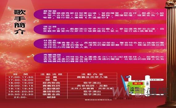 文化局表示,此次演出,配合中壢慈惠堂母娘文化節,特別邀請超級夜總會三位主持人澎恰恰、許效舜、苗可麗,以及多位實力派歌手,蘇宥蓉、張文綺、林俊吉、秀蘭瑪雅等藝人帶來精采演出,每位歌手將演唱多首經典臺語歌曲,加上主持群逗趣的互動,絕對讓現場觀眾捧腹大笑,活動內容精彩。