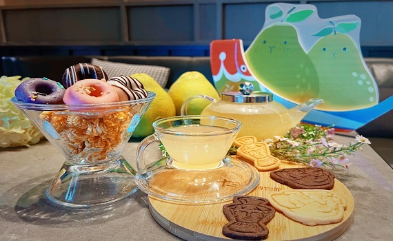 午茶套餐不只好看更是好吃!十三行限定「綠意柚香」組合,包括與知名品牌「卡滋爆米花」合作的「柚香焦糖爆米花」,每一口都能品嚐到濃郁柚香,以及八里福朋喜來登五星級酒店烘焙團隊研發製作的「人面陶罐手工餅乾」,造型別致口感酥脆;「文旦柚茶」則選用八里在地小農桃樂絲農場的精選柚子熬製,清爽解膩,並利用在地食材減少運輸與儲存過程中的碳排放,響應減碳永續生活。