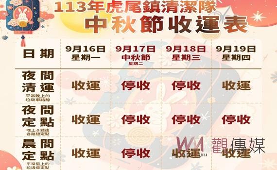 (觀傳媒雲林新聞)【記者蘇榮泉/雲林報導】虎尾鎮公所清潔隊公告,因應中秋節將於9月17日暫停收運垃圾服務一天。居民需留意當日垃圾不收,並提前做好相關安排。12日鎮公所公告中秋節收運表(見圖)提醒,由於垃圾未收運的影響,9月19日(星期四)夜間的定點垃圾收運也將停收一次。