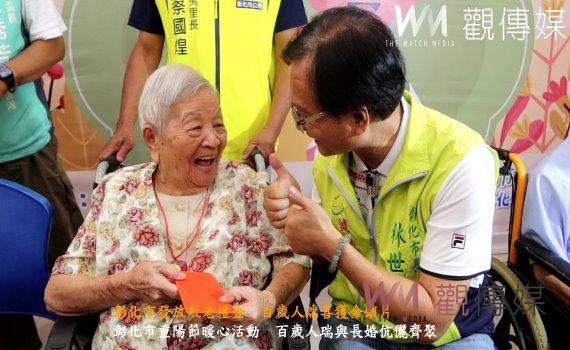 林世賢說,今年共有10對白金婚夫妻、133對鑽石婚夫妻、335對金婚夫妻接受表揚,肯定他們一生守護且珍惜婚姻的態度及感情,為現代年輕夫妻樹立典範。「彰化是長壽幸福的城市!」彰化市長林世賢強調,除了重陽敬老系列活動的敬老禮,彰化市另在春節會發放70歲以上長者6000元大紅包。