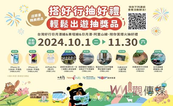 (觀傳媒中彰投新聞)【記者石振賢/南投報導】「2024日月潭Come!BikeDay花火音樂嘉年華」將自10月起登場,為鼓勵民眾搭乘大眾交通運具出遊,交通部觀光署日月潭國家風景區管理處(以下簡稱日管處)自113年10月1日起至11月30日期間推出「搭好行抽好禮」活動,於期間內搭乘台灣好行日月潭線、車埕線或日月潭-阿里山線,可於南投客運臺中干城站、高鐵臺中站、日月潭站、車埕遊客中心索取活動集章卡,並入住日月潭國家風景區埔里鎮、魚池鄉、水里鄉、集集鎮、信義鄉合法旅宿,或於合作店家消費滿新臺幣300元,除可兌換限量「喔熊組長」側背包,還可參加抽獎活動,有機會抽到iPhone15、AirPods Pro等熱門3C產品,以及承億文旅潭日月住宿券、涵碧樓雙人下午茶券、雲品溫泉酒店午餐券、九族文化村入園門票等轄區亮點旅遊體驗,總價值超過12萬元的多項好禮。