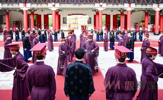 (觀傳媒桃竹苗新聞)【記者曾平/桃園報導】桃園市各界紀念大成至聖先師孔子誕辰2574週年釋奠典禮,今(28)日上午在桃園市孔廟舉行,祭孔大典依循古禮三獻儀式及32道程序,由市長張善政擔任正獻官,今日禮生、樂生由桃園高中、青溪國中學生擔綱,東門國小則擔任佾生於大成殿演繹六佾舞,左手執一籥、右手持翟,隆重展開釋奠佾舞,鐘鼓齊鳴,場面莊嚴。
