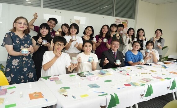 在開幕式後,詹校長與學生一同參加「沙畫薰香蠟燭DIY」活動,實際體驗「興憩小站」系列的「媒材手作工作坊」,師生們藉由手作活動紓解壓力。