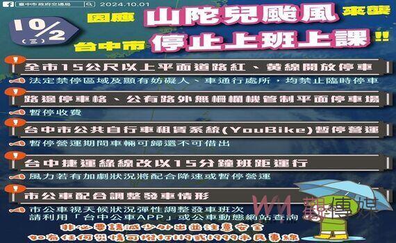 此外,台中市公共自行車租賃系統於明日凌晨1時起全面暫停營運,暫停營運期間車輛可歸還不可借出,恢復營運時間將視風雨狀況另行公告。若使用租賃系統遇有任何問題與狀況,可撥打YouBike客服專線04-23696922,站點資訊可至微笑單車官網( https://www.youbike.com.tw/region/i/ )查詢。