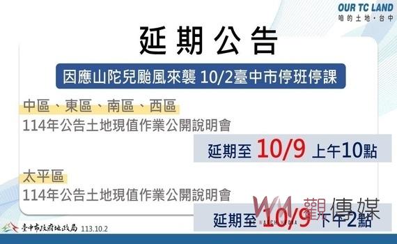 (觀傳媒中彰投新聞)【記者廖妙茜/台中報導】台中市中山及太平地政事務所原訂分別於今(2)日上午10時及下午2時召開114年公告土地現值作業公開說明會,因山陀兒颱風來襲,故分別延至今年10月9日上午10時及下午2時。