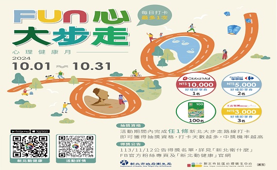 (觀傳媒新北新聞)【記者蔡宇辰/新北報導】為鼓勵民眾健走達到舒壓照顧心情,新北市衛生局舉辦「Fun心大步走」心理健康月健走活動開跑,為鼓勵市民多多走出戶外,養成健走習慣,促進身心健康,搭配新北動健康APP,完成指定任務就有機會把萬元電子禮券帶回家,另外,活動也邀請到新北市多家企業共同響應,並且由心衛中心與企業合作,同步推出各式主題的「職得用心待你」職場心理健康系列講座,陪伴大家在生活中跟職場上都能「Fun心大步走」。