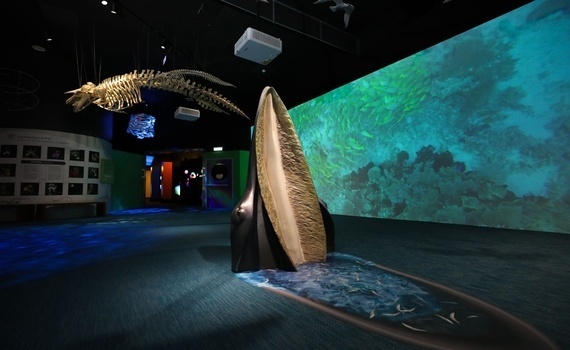 ▲《奇幻自然》展區的〈追呀追:計算與行為〉天花板懸掛鯨豚骨骼模型,搭配光影營造海洋意象,還有互動裝置可聆聽鯨豚的聲音。