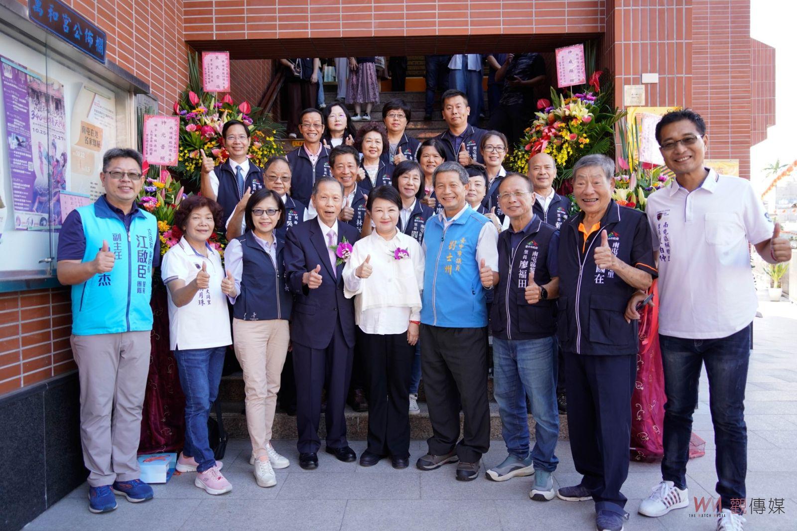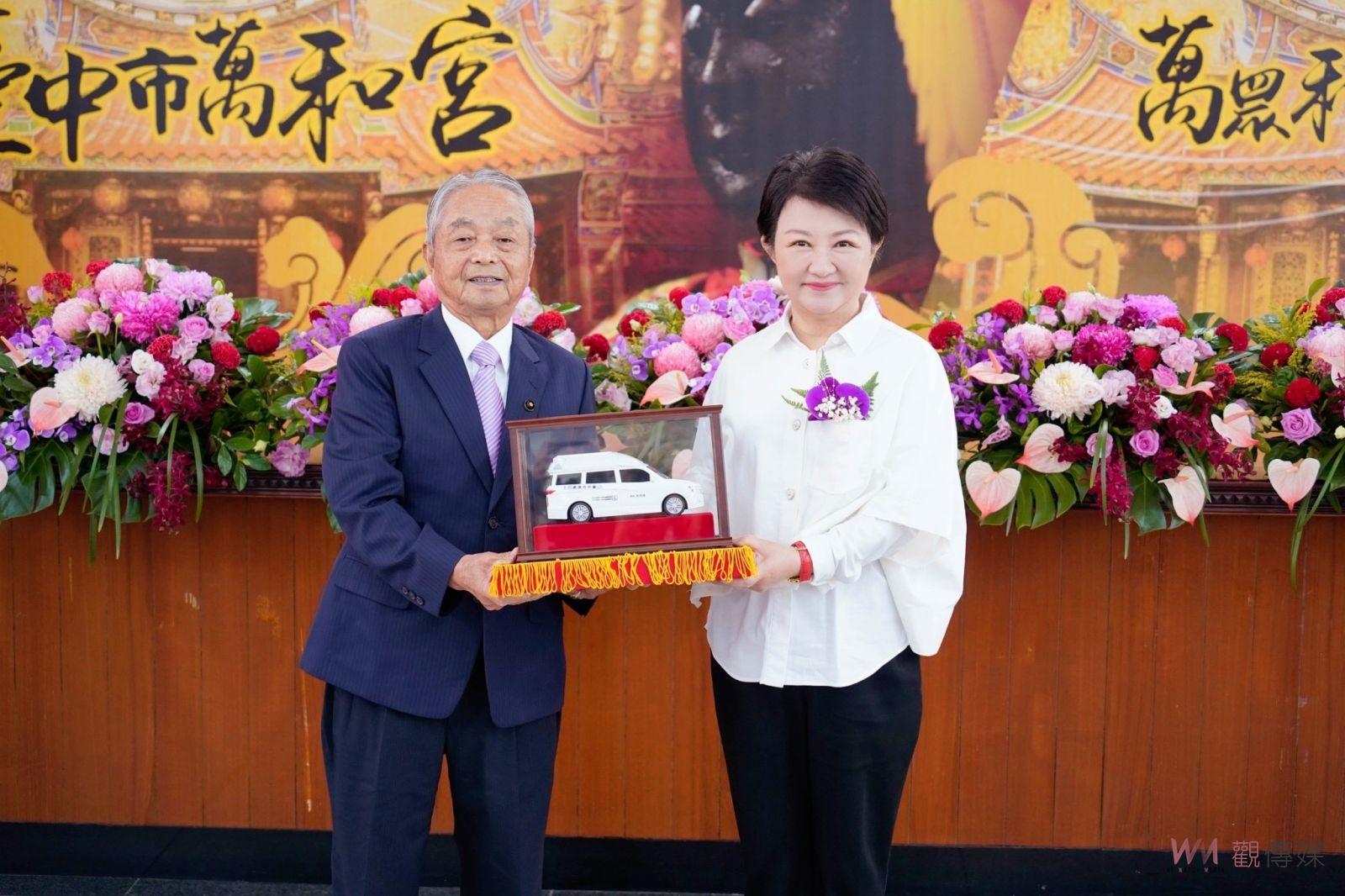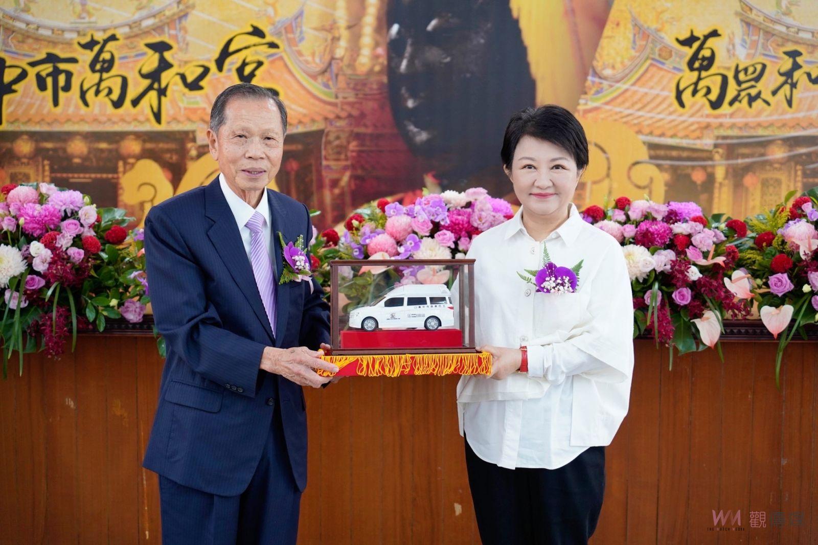 ▲萬和宮捐贈復康巴士,台中市長盧秀燕與來賓合影。