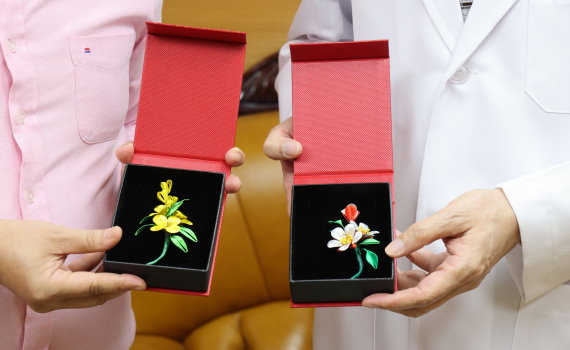 周裕穎與林佩瑩合作的春仔花胸花,融合梅花和油菜花的意象,讓中華健兒帶著全國人民美好祝福參賽,也傳達員榮醫療體系總院長張克士率領醫療團隊支持中華代表隊。中華奧會肯定員榮醫療系贊助,頒贈感謝狀和限量版的梅花、油菜花春仔花胸花。