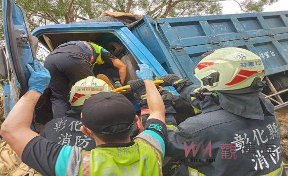 ▲員林市員草路二段發生一起貨車摔落邊坡事件,乘客受困車內由救護人員動用破壞器材救出送醫。