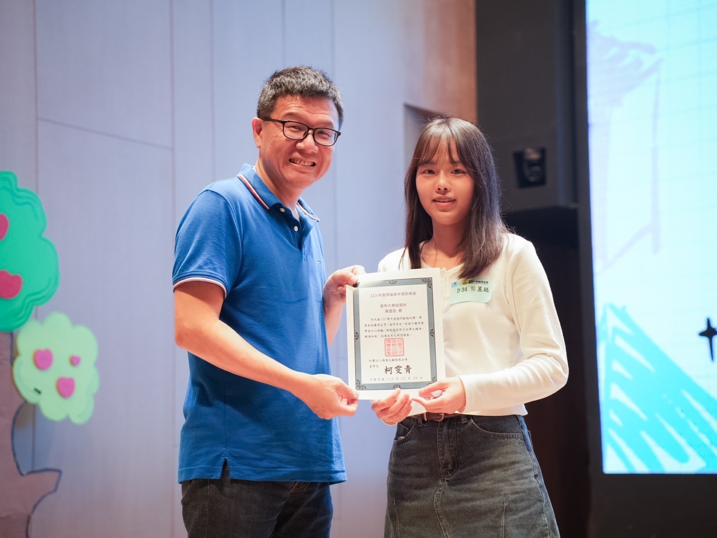 19歲的唇裂女孩葉昱廷現在是個活潑自信的女大學生,在亞洲大學聽力暨語言治療學系擔任系學會副會長,積極參與校園事務。其從小在父母正向看待顱顏疾病的教養環境中成長,讓她活潑外向,喜歡與人互動。大學時選擇就讀聽力暨語言治療學系,並在母親常年擔任基金會志工的耳濡目染下,也期許自己未來成為一名語言治療師,回饋基金會幫助更多有發音問題的顱顏孩子,透過語言治療不再有咬字問題。得福獎學金的榮譽,也鼓舞葉昱廷繼續朝語言治療師的目標邁進。