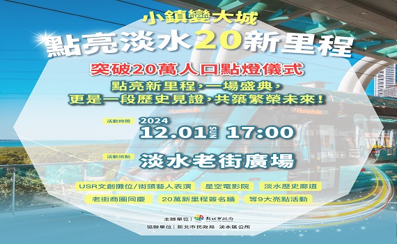 (觀傳媒新北新聞)【記者蔡宇辰/新北報導】新北市淡水區人口19日達19萬9979人,即將突破20萬,為紀念這歷史性的里程碑,新北市於12月1日在淡水老街廣場,將舉行「小鎮變大城 點亮淡水20新里程」點燈慶祝活動,當天規劃有淡水歷史廊道、《不能說的•秘密》星空電影院、文創攤位等9大亮點,燈期則持續至明年2月13日。市長侯友宜邀請所有市民及喜愛淡水的國內外朋友,一同分享淡水從小鎮邁向繁榮文化城市的喜悅。