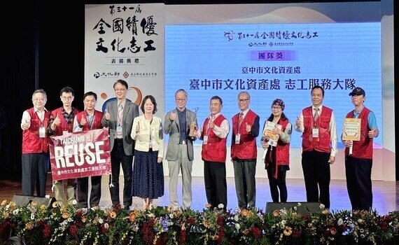 (觀傳媒中彰投新聞)【記者廖妙茜/台中報導】全國文化志工團隊最高榮耀今年再度獎落台中!台中市文化資產處志工隊獲頒文化部「全國績優文化志工團隊獎」,由台中市政府文化局主任秘書蕭靜萍、台中市文化資產處長李智富及志工隊長王清耀,率領志工代表們共同北上領獎,蕭主秘代表台中市長盧秀燕感謝台中市文化資產處志工服務大隊長期耕耘、奉獻,樂當文化資產重要推手。這次獲獎實至名歸,讓文化局同仁也與有榮焉。