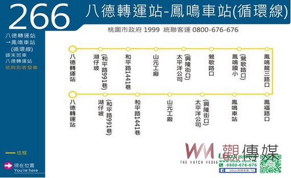 交通局指出,【266】八德轉運站-鳳鳴火車站試辦路線全長8公里,平日營運13班次,設有15個停靠站。該路線由八德轉運站出發,途經和平路、大仁路、桃鶯路、鶯歌路、鳳一路,最終抵達鳳鳴火車站,然後再循環返回八德轉運站。收費採市區公車里程計費,並適用基北北桃1200月票方案。此外,持桃園市民卡搭乘可享受買一送一優惠,以及第二趟搭乘18元的優惠。【266】路線為循環線,行駛方式為自八德轉運站出發,至鳳鳴火車站後折返。民可透過桃園市公車動態資訊系統網站(https://ebus.tycg.gov.tw/ebus/)或下載「桃園公車」APP查詢公車路線、班次及動態資訊。