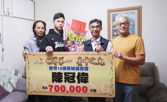 (觀傳媒中彰投新聞)【記者顏淑娟/台中報導】全球矚目的「2024年世界12強棒球錦標賽」我國奪下冠軍,每位選手都表現亮眼、功不可沒,其中投手陳冠偉來自台中。中市府運動局代理局長游志祥昨(29)晚代表市長盧秀燕,親自到陳冠偉家拜訪,恭賀這位台中之光載譽歸國,並頒贈紅榜、花束及捷運終身免費卡,更頒發體育獎金70萬元祝賀表揚。