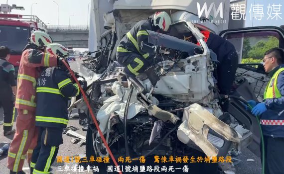 (觀傳媒彰化新聞)【記者陳雅芳/彰化報導】國道1號北上207.4公里處埔鹽系統路段,今(30日)上午9時50分發生三車碰撞嚴重車禍!其中大貨車頭嚴重變形,車內3人受困, 2名乘客當場失去生命跡象,經送醫急救仍告不治,駕駛躲過一劫,送醫時僅下唇撕裂傷、意識清醒,詳細肇事原因由國道第三警察隊調查釐清。