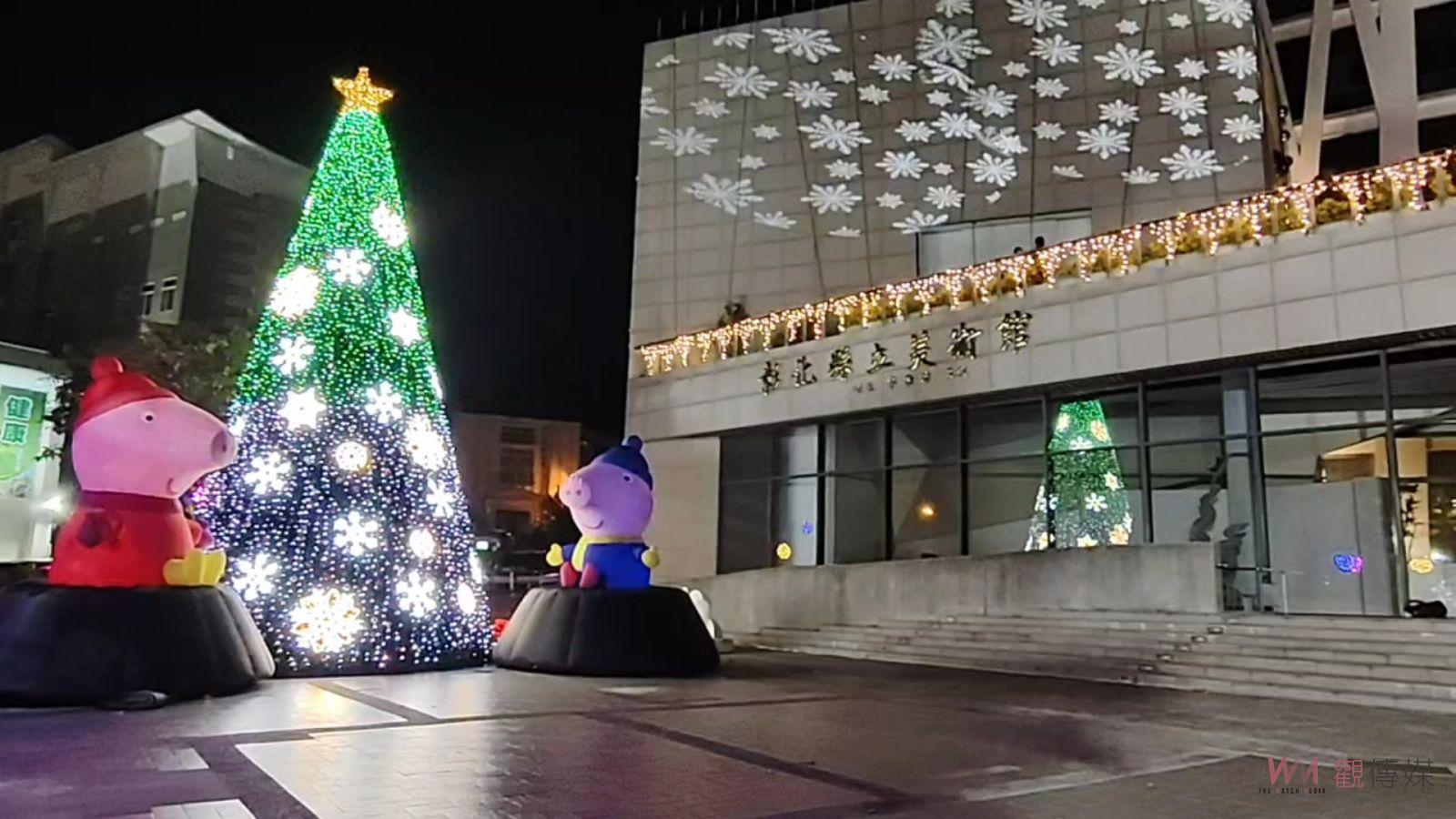 ▲彰化縣立美術館前廣場將在13日晚上6時辦理聖誕點燈,深受小朋友們喜愛的知名動畫「粉紅豬小妹」家族氣偶,與大家一同歡慶繽紛聖誕節。