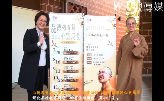 (觀傳媒彰化新聞)【記者陳雅芳/彰化報導】彰化縣政府自今年7月起舉辦品德教育及心靈成長系列講座,歷經半年、六場次後,今(15)日上午在彰化縣立圖書館1樓演講廳舉行最後一場,由佛光山福山寺住持妙宥法師壓軸演講,講題為「Hello! 開心不難」。縣長王惠美與現場民眾共同學習妙宥法師分享的「開心三方法」。