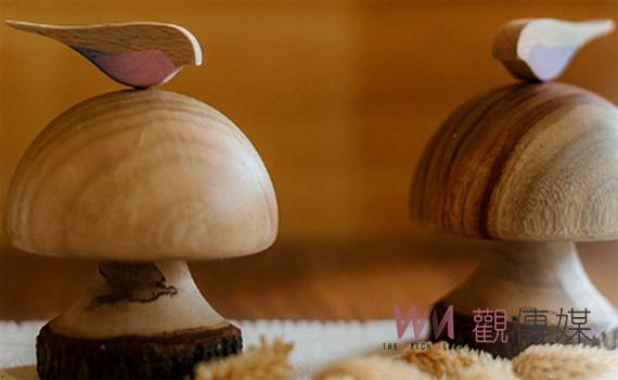 「森菇鳥影音樂鈴」是目前蒔木工坊最夯的文創商品,產品運用台灣樟樹製成,外觀為飽滿的半圓形,曲面造型與加工讓材料與紋理顯得與眾不同,同時利用磁力和平衡機制,讓上方飾件像愉悅小鳥鳴唱般躍動,搭配雨夜花的音樂鈴聲,是結合嗅覺、視覺、觸覺及聽覺的療癒小物,深獲消費者喜愛,去年參加巴黎設計展大獲好評,至今累積銷量已超過上千個。