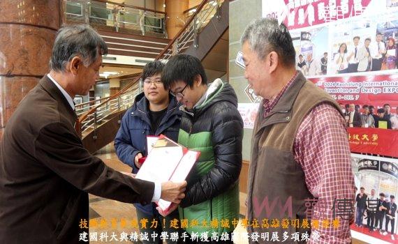 ▲建國科大與精誠中學聯手亮相第11屆高雄國際發明暨設計展,榮獲4金、5銀、3銅及大會最高榮譽的鉑金獎,獲得多項殊榮。