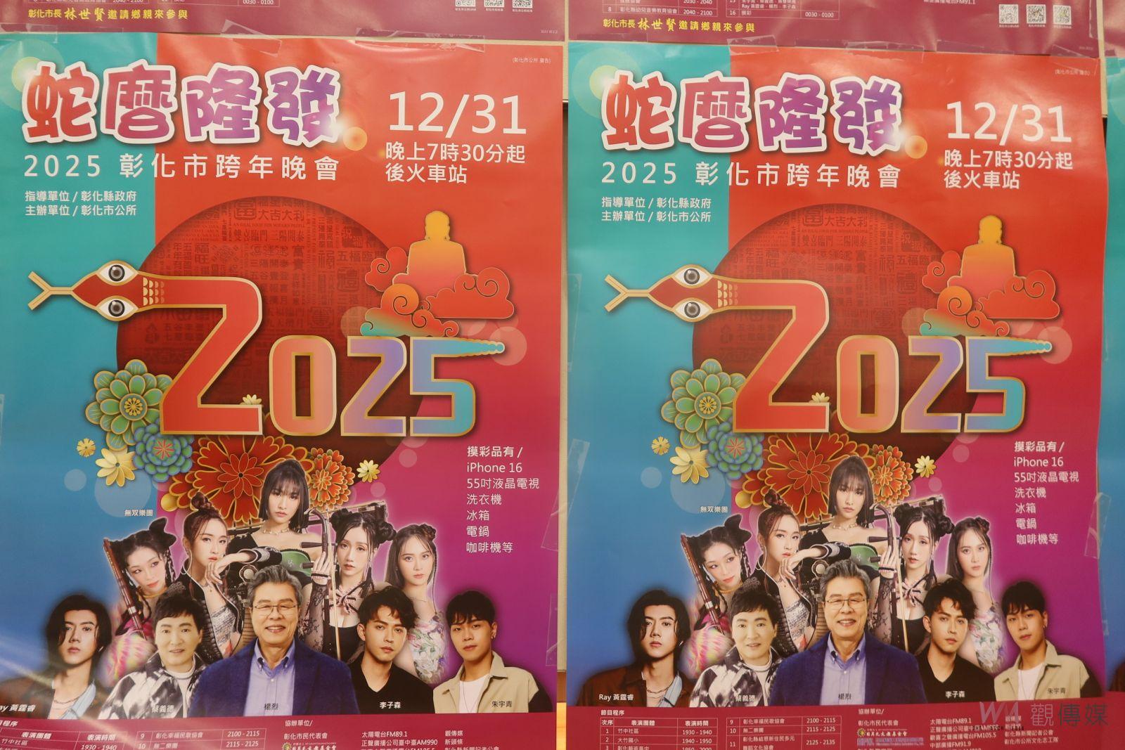 (觀傳媒彰化新聞)【記者陳雅芳/彰化報導】為迎接2025年「蛇年」,彰化市公所定12月31日晚上7點30分起,在後火車站辭修路舉辦跨年晚會,邀請超偶冠軍李子森、鋼琴王子黃霆睿、無雙樂團等多組卡司接力演唱,還有金曲歌王楊烈陪著一同倒數,還有摸彩助興,彰化市長林世賢歡迎鄉親一起來High翻跨年夜,期待新的一年「蛇麼隆發」。