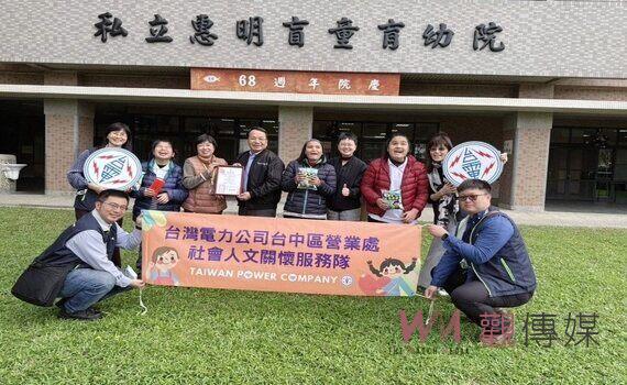 台電台中區處除於16日,參與了華山基金會所辦理的「募愛心年菜」活動,由台電同仁們親自為老寶貝們端上豐富美味的年菜,提前與長輩們一同圍爐、話家常,更與長輩們一同在耶誕樹海報上寫下來年的願望,象徵新年新氣象!17日下午,台電志工們亦帶著耶誕老公公滿滿的祝福及關懷,來到位於西屯的「光音育幼院」,關懷探望院內所收容安置的低收入戶、失依失怙等弱勢孩子,光音育幼院的盧鳳凰督導表示,走過一甲子歲月的光音,撫養自立的院童已超過千名,期望讓這群雖然沒有親人的關心支持的弱勢孩童,能夠在光音這裡擁有愛他們的老師,以及專業的照顧服務,進而健全成長、建立自信心,培養正向積極人生觀、獨立生活能力,更期待離院後的孩子能夠發揮潛能,多元發展,進而回饋社會。18日上午,台電的耶誕老公公則是來到了「惠明盲校」,繼往年曾帶領惠明盲校學生體驗騎乘載著樂趣、辦理捐贈百斤百米等活動,惠明盲校育幼院的院長王玲玲更特別請惠明的學生們為台電志工們帶來了精彩的歌唱表演,讓台電同仁也在顏處長耶誕老公公的帶領下發送餅乾糖果給惠明的學生,整個校園洋溢著歡樂的氣氛與笑聲。