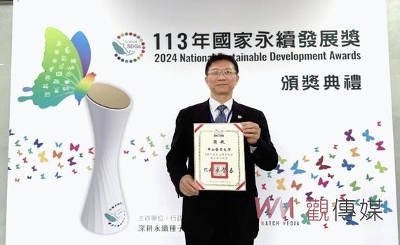 (觀傳媒中彰投新聞)【記者廖妙茜/台中報導】追求2050淨零排放目標,行政院國家永續發展委員會表揚推動永續發展績效卓越單位。台中中山醫學大學(以下簡稱中山醫大)在教育類憑藉聚焦高齡科技照護、智慧能源管理等優異成果脫穎而出,榮獲國家永續發展獎教育類入選獎殊榮,今(19)日由行政院政委兼國發會主委劉鏡清親自頒獎,給予肯定。