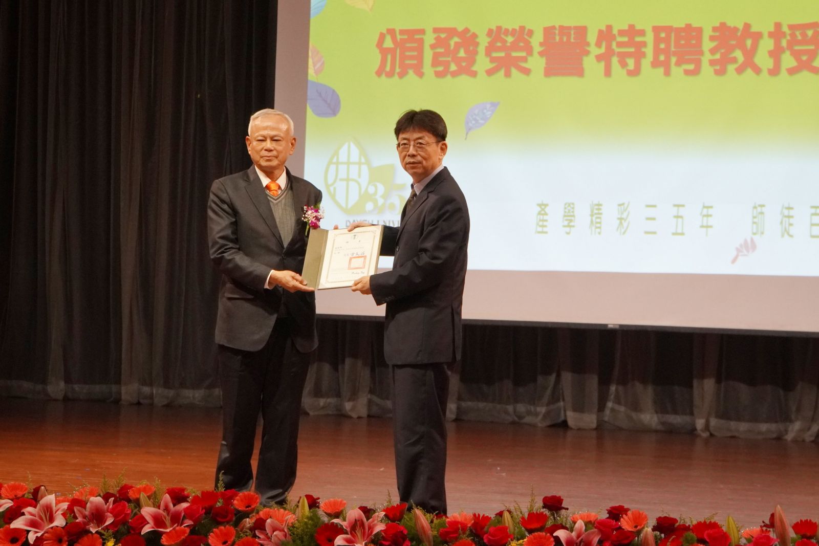 ▲大葉大學方文昌校長(右)頒發榮譽特聘教授給傑出校友陳錫堯。