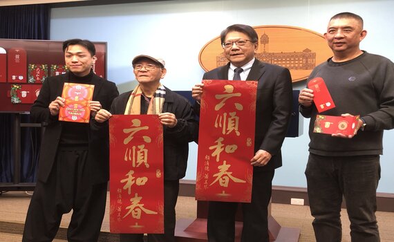 總統府秘書長潘孟安、發言人郭雅慧跟設計師李明道、書畫家陳吉山、設計總監李明,30日舉行「中華民國114年總統、副總統賀年卡、春聯、紅包袋、福袋及網站改版」公布記者會。