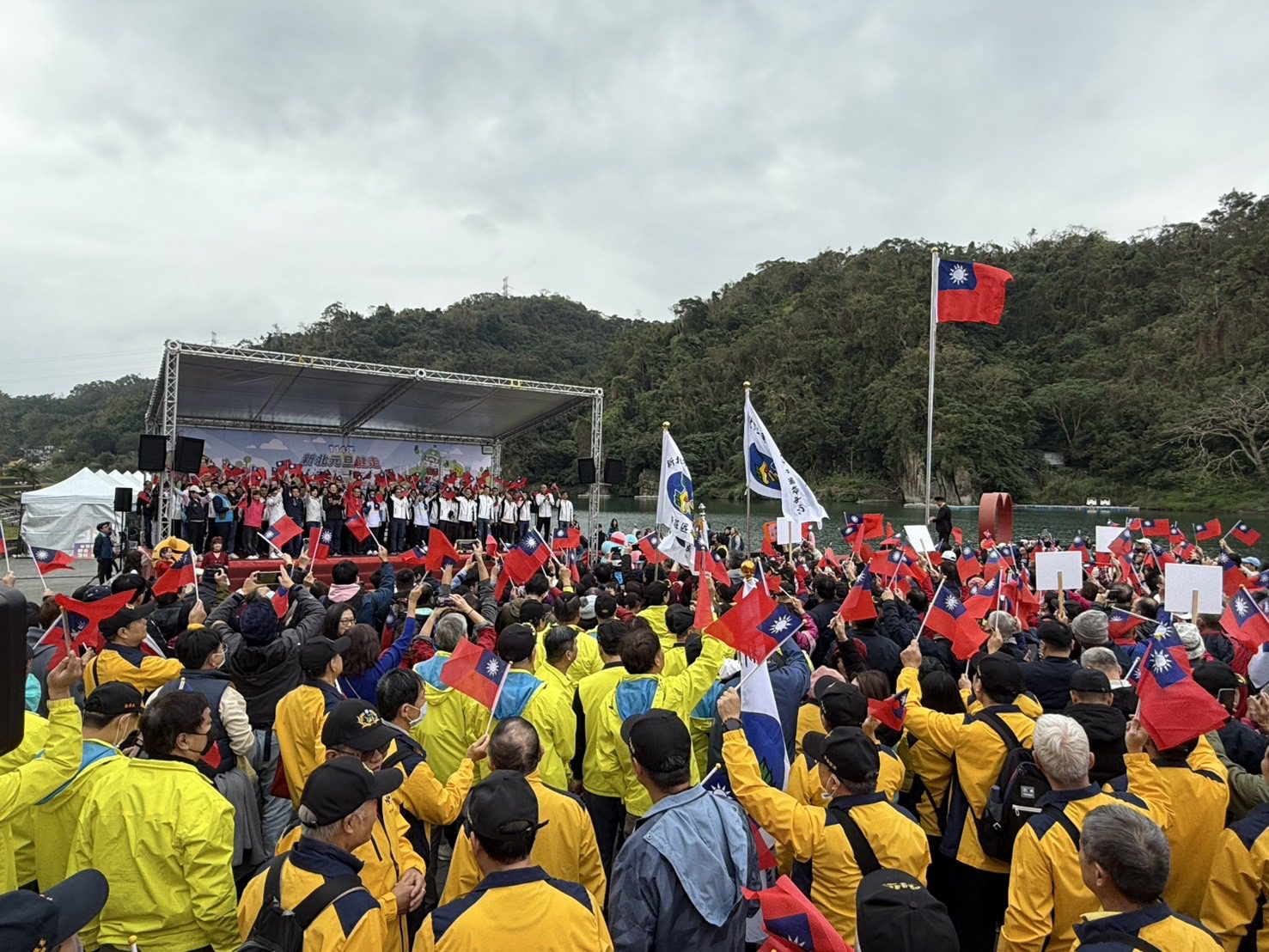 新北市114年元旦升旗暨健走活動,今(1)日於新店區碧潭東岸廣場登場,有4000多位大小朋友湧入現場,大家在起跑點大聲喊出「勇往直前一起GO!」,象徵為2025揭開美好篇章。新北市長侯友宜表示,自己的新年心願是「團結台灣」、「團結中華民國」,讓我們用「雙和」和諧、合作,找到進步的方向。
